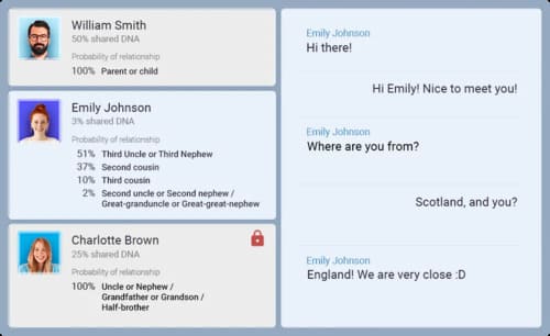 Naast voorouders kunt u ook gebruikmaken van de functie Quick Connect, waarmee u genetische overeenkomsten kunt identificeren en contact kunt leggen, met andere woorden, potentiële verre neven en nichten.