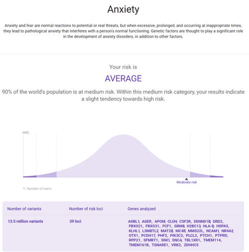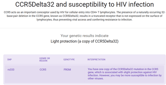 Het beoordeelt ook de risico’s die gepaard gaan met meer dan 100 monogene erfelijke ziekten (bèta-thalassemie, cystische fibrose, enz.). Ruwe genetische gegevens (20 MB, chip array-formaat) kunnen worden gedownload en updates zijn levenslang gratis.