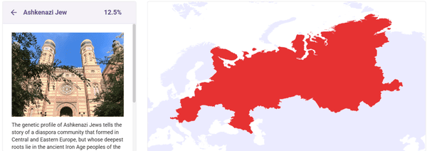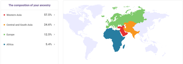 Met TellMeGen kunt u uw genetische geschiedenis en de migratiebewegingen van uw voorouders over een periode van 200.000 jaar traceren. Het rapport geeft uw procentuele lidmaatschap weer van 93 etnische groepen verspreid over 7 grote geografische gebieden: