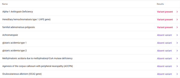 Na analyse van uw monsters ontvangt u van het laboratorium een uitgebreid gezondheidsrapport over uw genetische kwetsbaarheid voor complexe ziekten en uw vatbaarheid voor erfelijke monogene ziekten, zoals familiale borstkanker, transthyretine-amyloïdose en alfa-1-antitrypsine-deficiëntie.