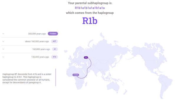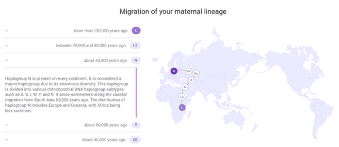 U zult uw moederlijke haplogroep (mitochondriale afstamming), uw vaderlijke haplogroep (Y-chromosoomafstamming) en het deel van uw DNA dat u deelt met Neanderthalers ontdekken.