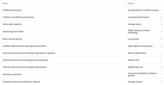 | 📈 Resultatenrapporten | Etnische afkomst Persoonlijke eigenschappen Genetische vatbaarheid voor gezondheidsproblemen Farmacologische compatibiliteit Welzijnsinformatie |